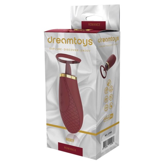 Stymulator Romance Roxy zapakowany jest w pudełko o typowej romantycznej stylistyce: tło z białej satyny, złote akcenty, wyraźne zdjęcia zabawki, wielojęzyczny opis na odwrocie, ikony umożliwiające szybki przegląd funkcji i wymiary na ściance bocznej opakowania. Roxy łączy dwa doznania dla łechtaczki lub sutków w jednym stymulatorze. Przyssawka zapewnia intensywne doznania dzięki 3 siłom ssania, od lekkiego do silnego. Poruszający się język zapewni ekscytującą stymulację za pomocą 9 rytmów. Możliwość ładowania za pomocą dołączonego magnetycznego kabla USB. Wodoodporny (IPX7). Hałas < 55dB. Wykonany z silikonu medycznego i ABS, bezpieczny dla ciała.